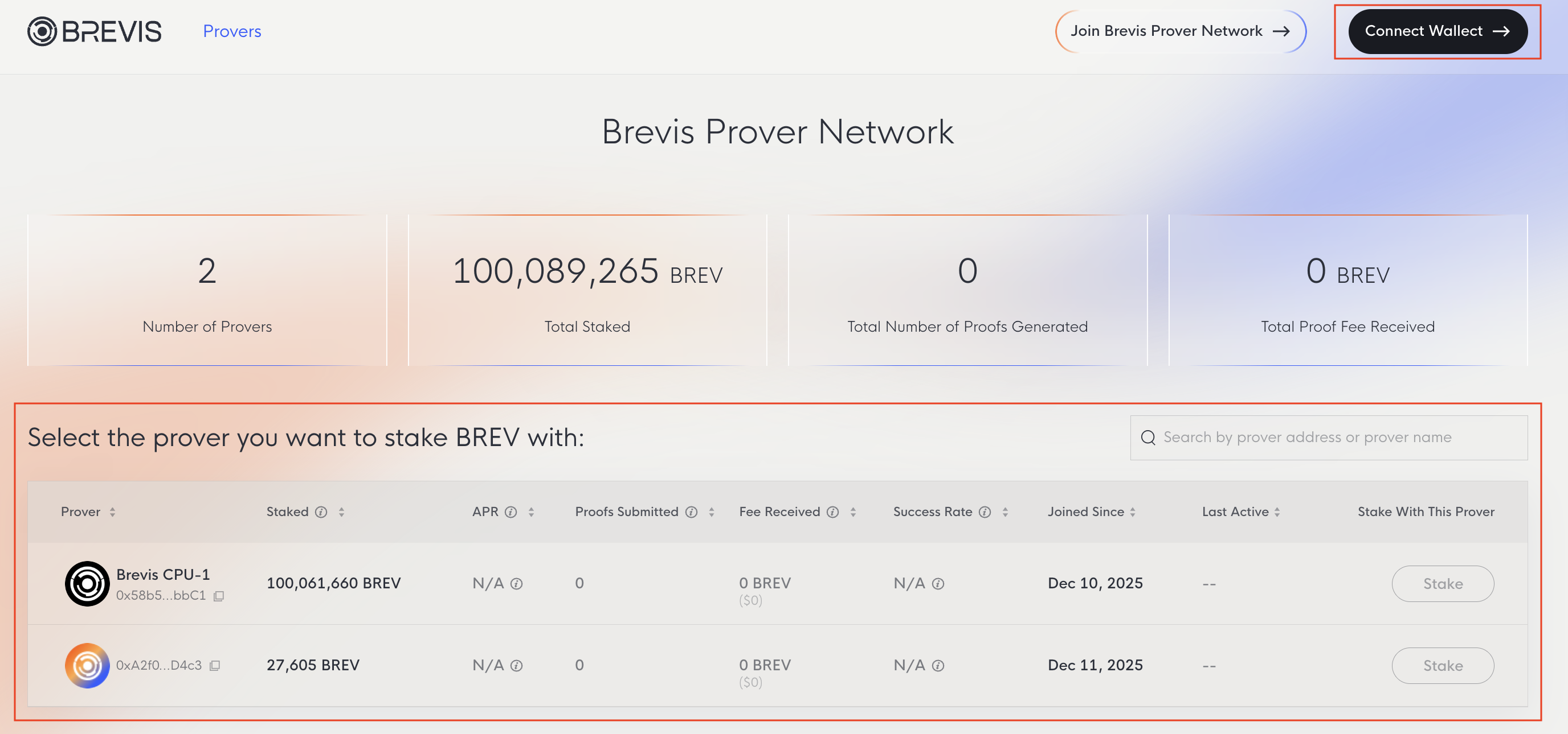 To start staking your BREV, you will need to connect wallet and select the prover you would like to stake with.