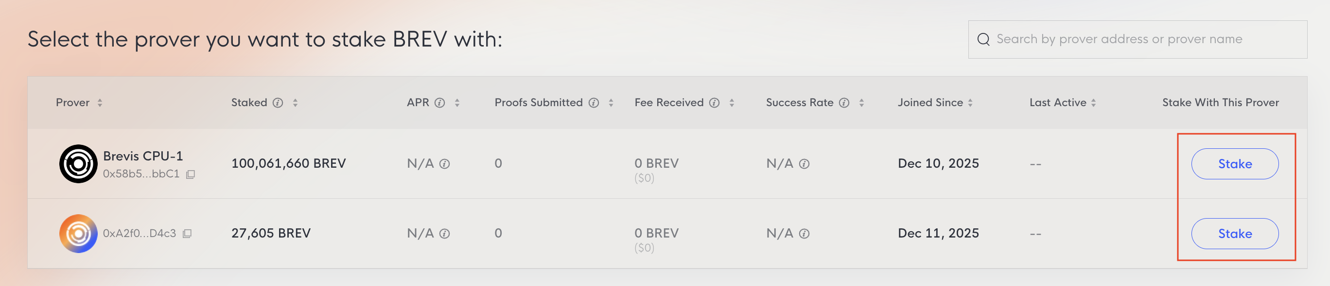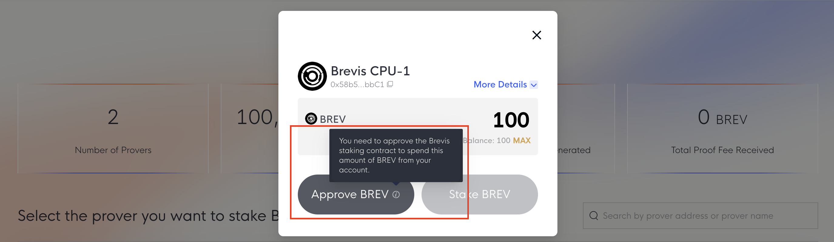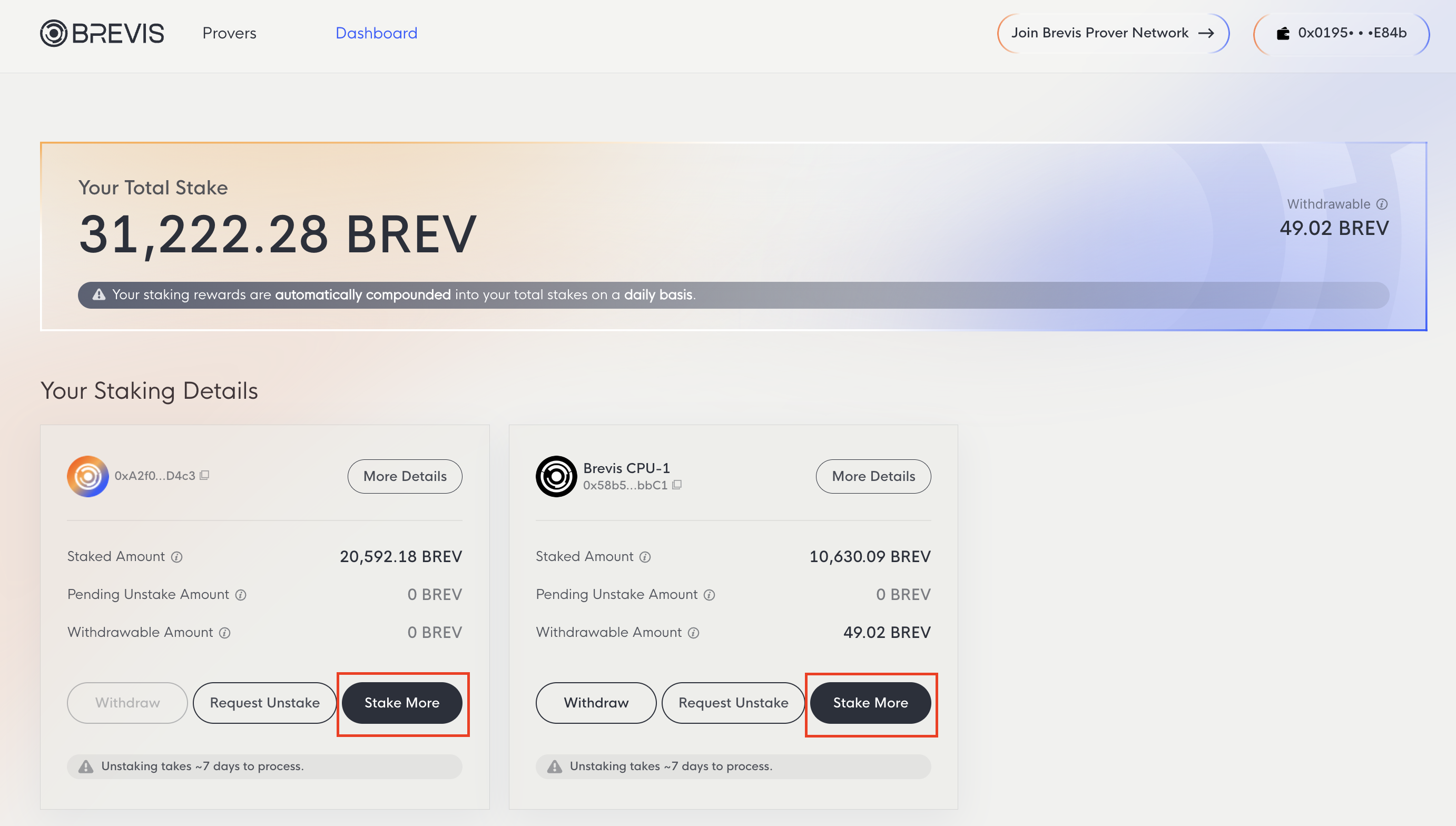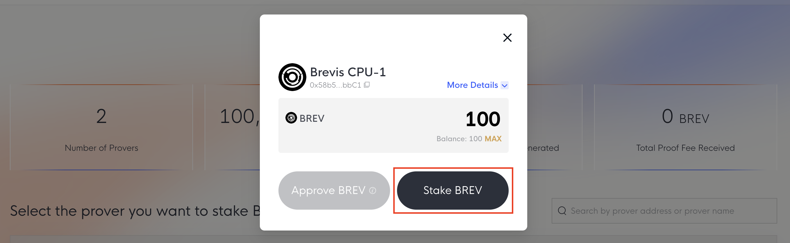 You can also increase your stake with provers you’ve already delegated to. Visit the Dashboard [Link] to see your current delegated provers and use the Stake More option to add additional BREV.