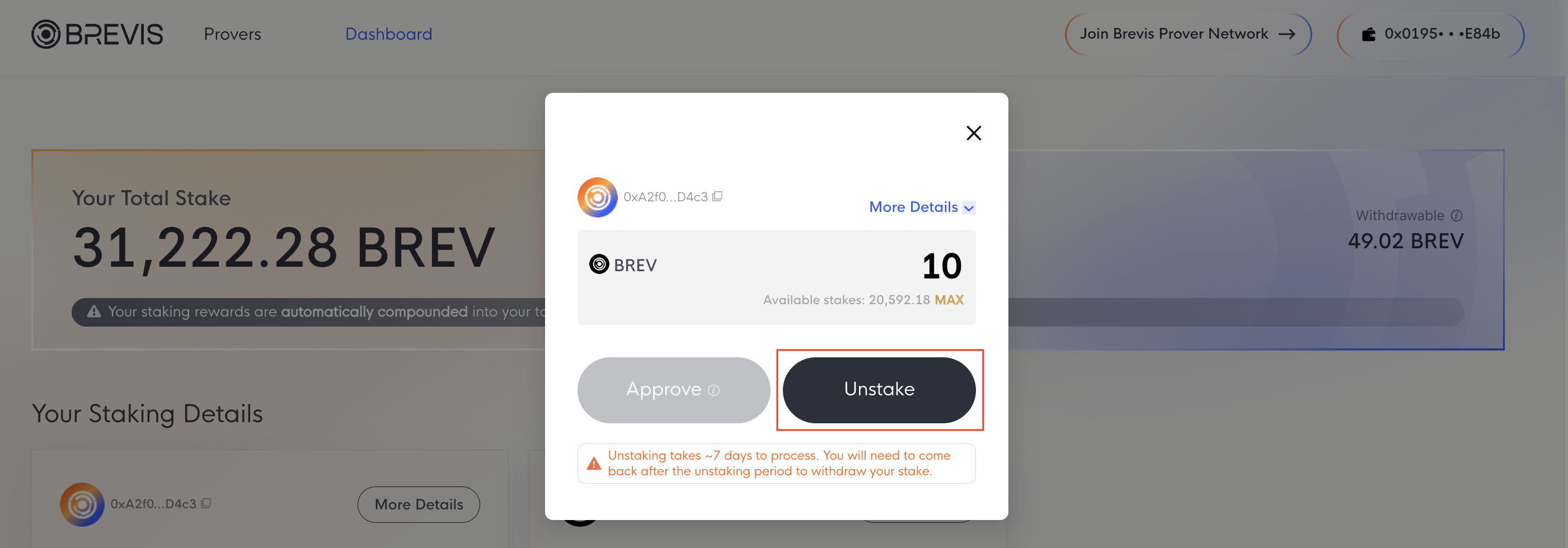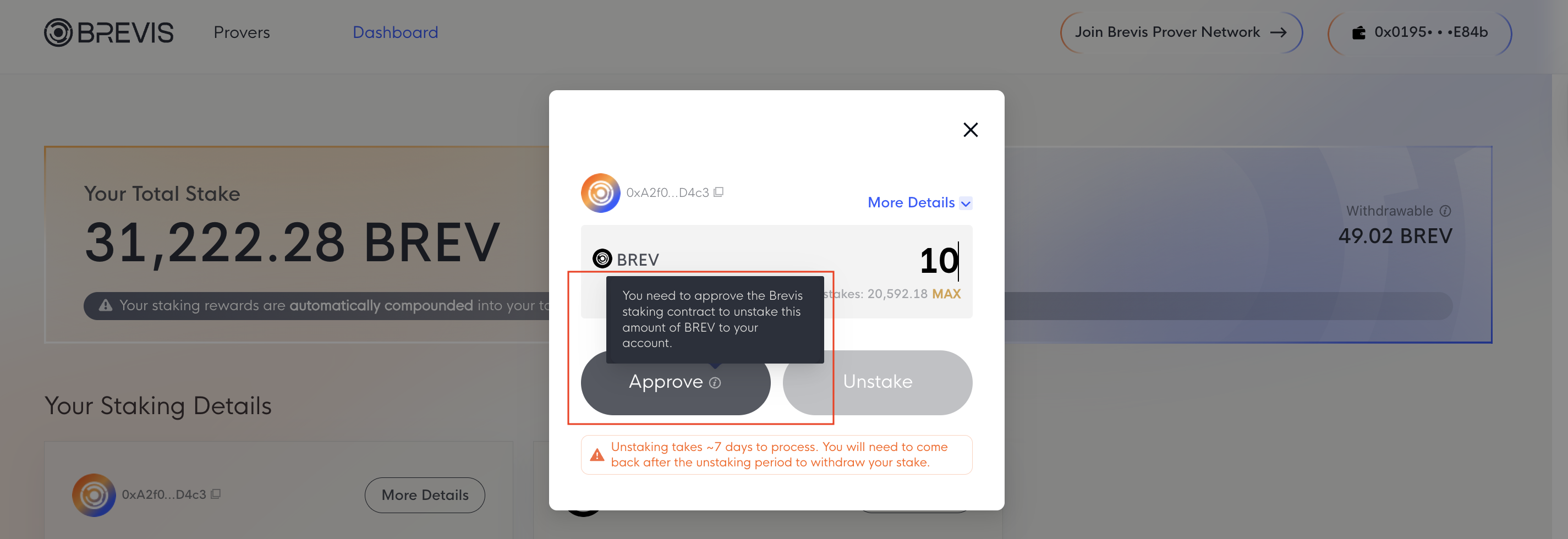 - Your total stake: includes all your staked BREV to each prover plus the staking rewards you’ve earned. The staking rewards are automatically compounded into your total stake on a daily basis.
