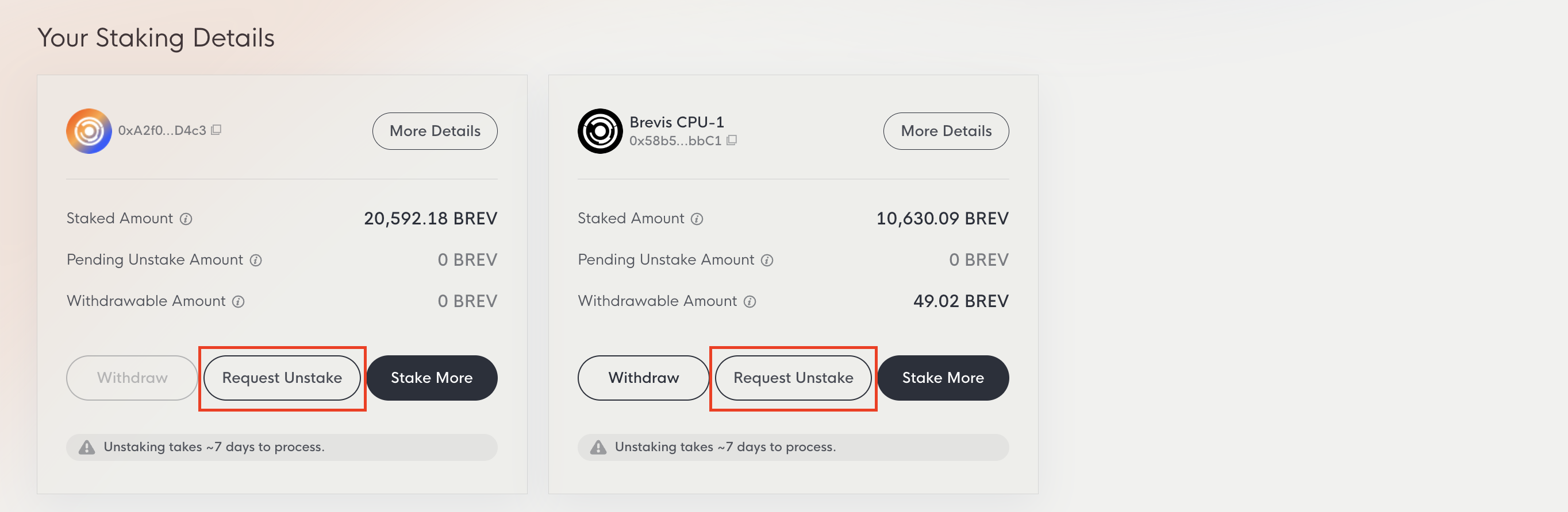 First, you may need to Approve the Brevis staking contract to allow it to unstake your BREV. Once sufficient amount is approved, the Unstake button will be enabled, and you can submit the unstake transaction. Please note that the unstaking process takes 7 days. After the waiting period, you can withdraw your BREV and have them returned to your account.