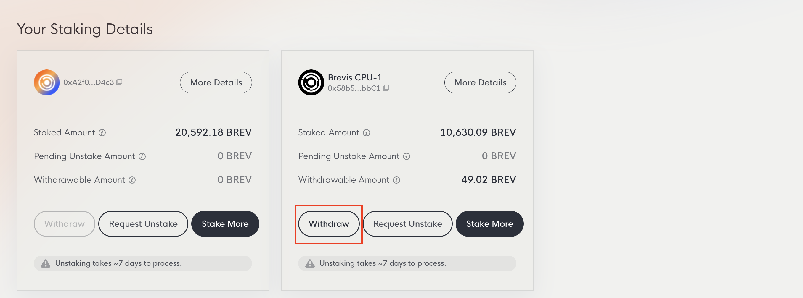 You can withdraw your unstaked BREV once the 7-day processing window has passed, by simply clicking the Withdraw button on the Dashboard page. If you have no unstaked BREV or your unstaked BREV is still within the 7-day waiting period, the Withdraw button will be disabled.