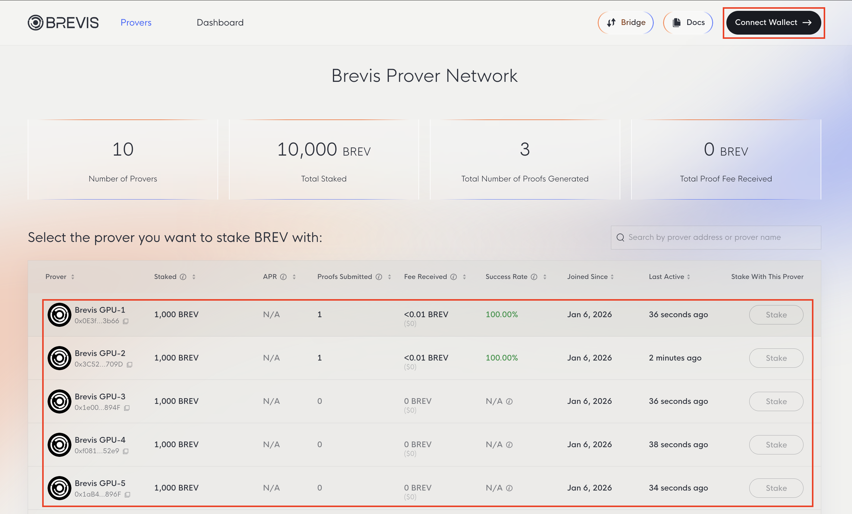 Visit the Brevis Prover Network to view all active provers along with key statistics including BREV staked, proofs generated, and fees earned.