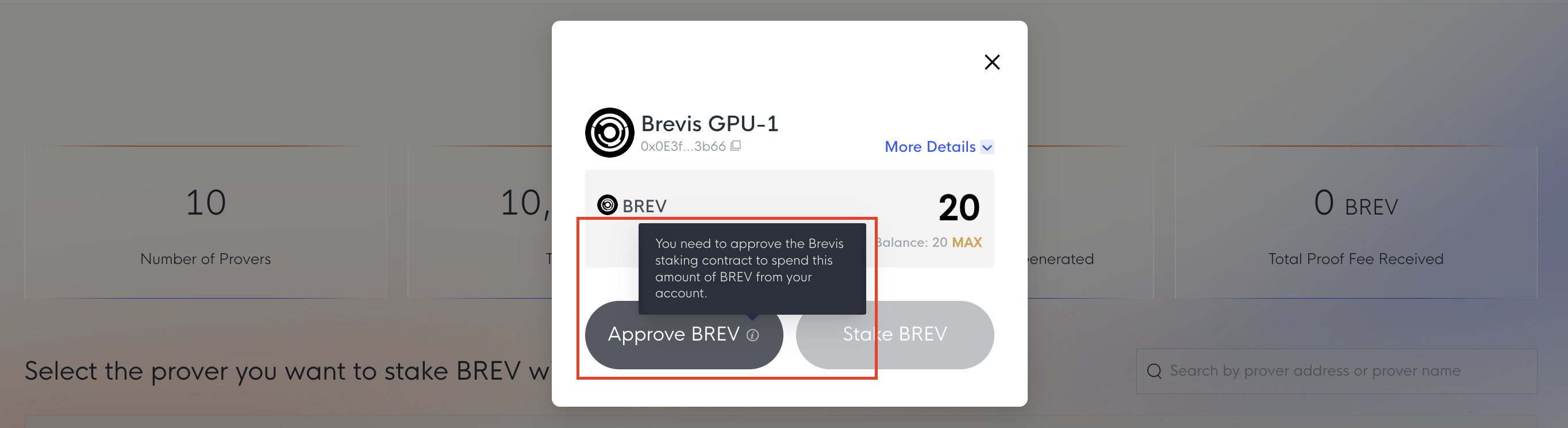 You may need to Approve the Brevis staking contract to allow the spending of BREV first. Once approved, you can submit the stake transaction.