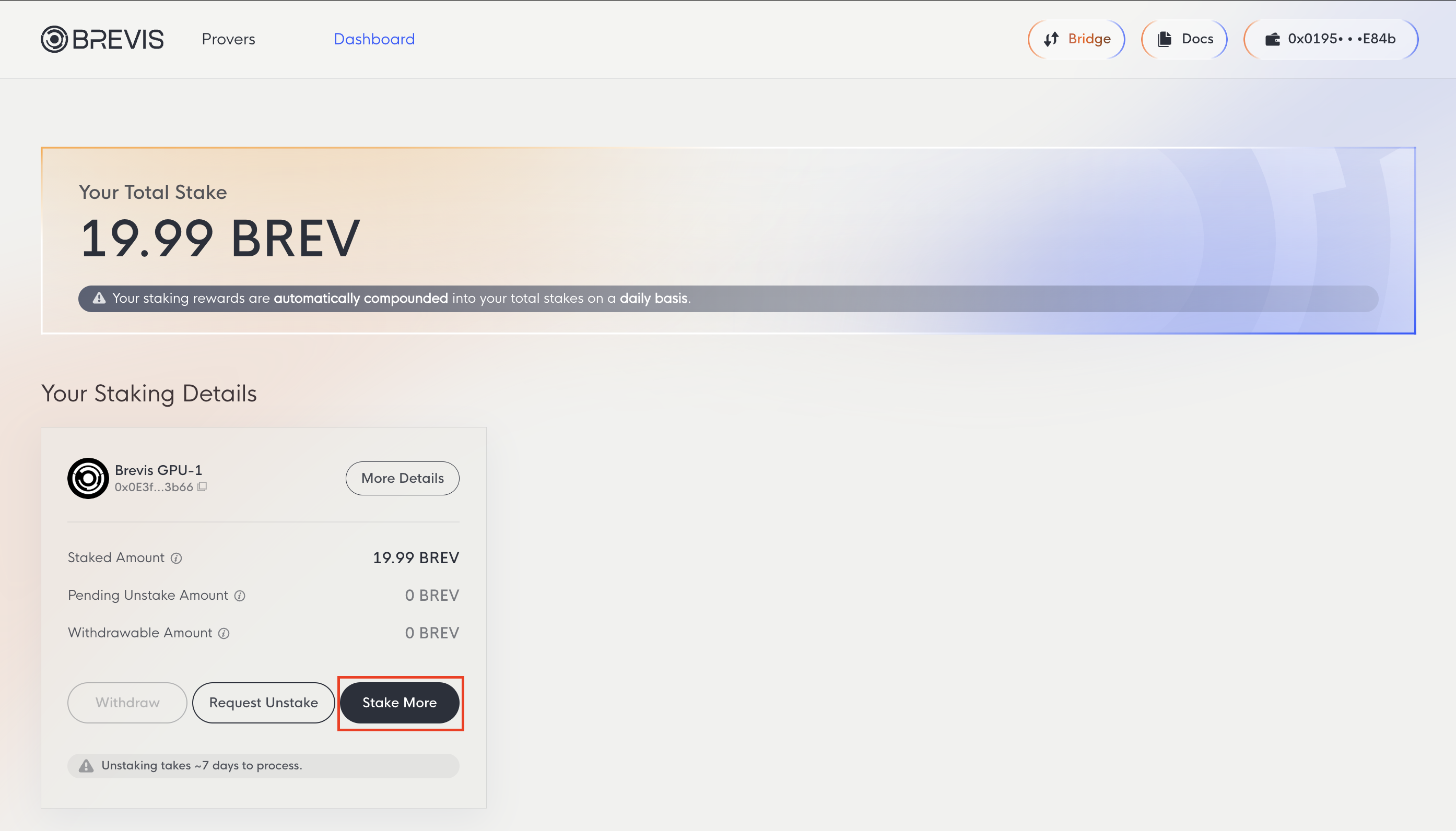 - Your Total Stake: All BREV staked across provers plus earned rewards. Rewards compound automatically on a daily basis.