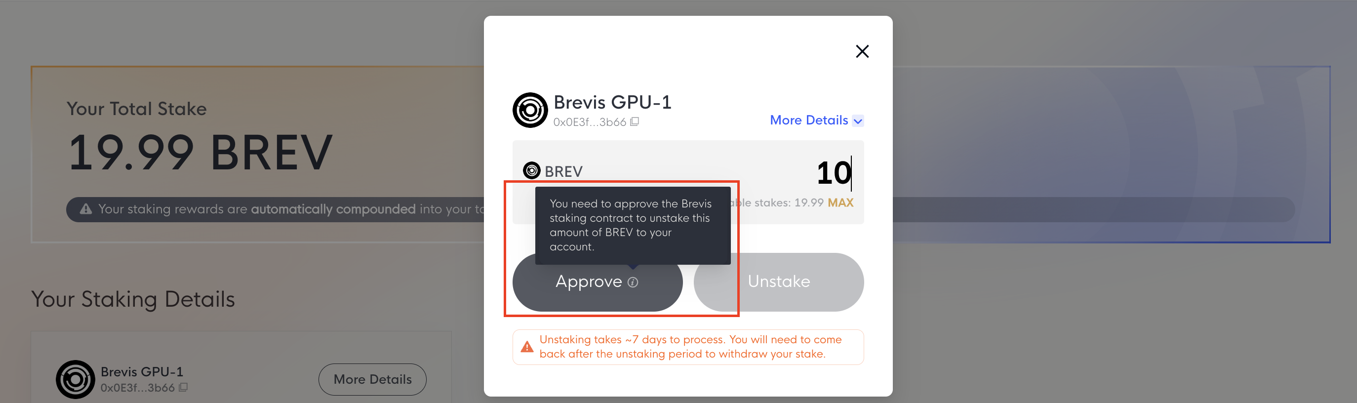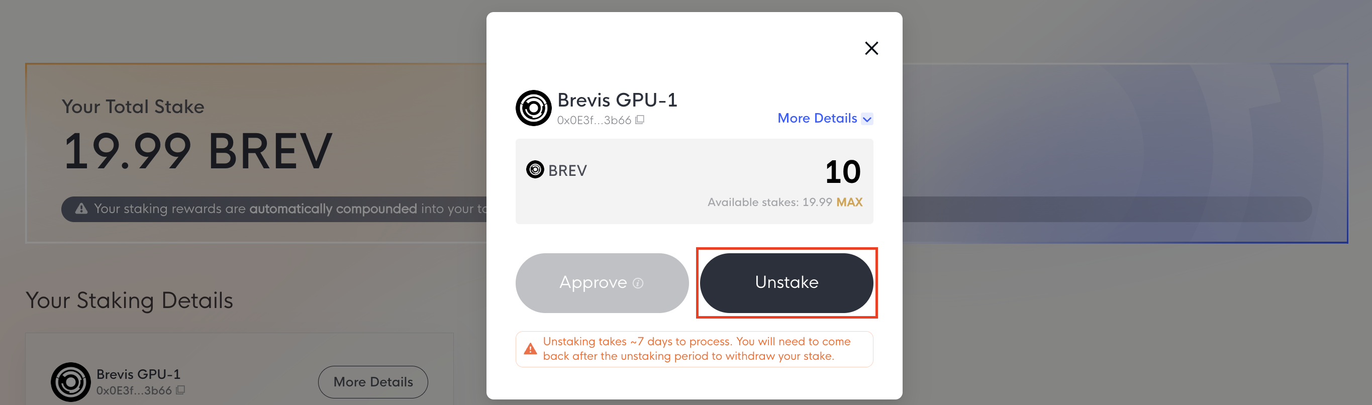 You may need to Approve the Brevis staking contract first. Once approved, submit the unstake transaction. The unstaking period is 7 days. After the waiting period, you can withdraw your BREV.